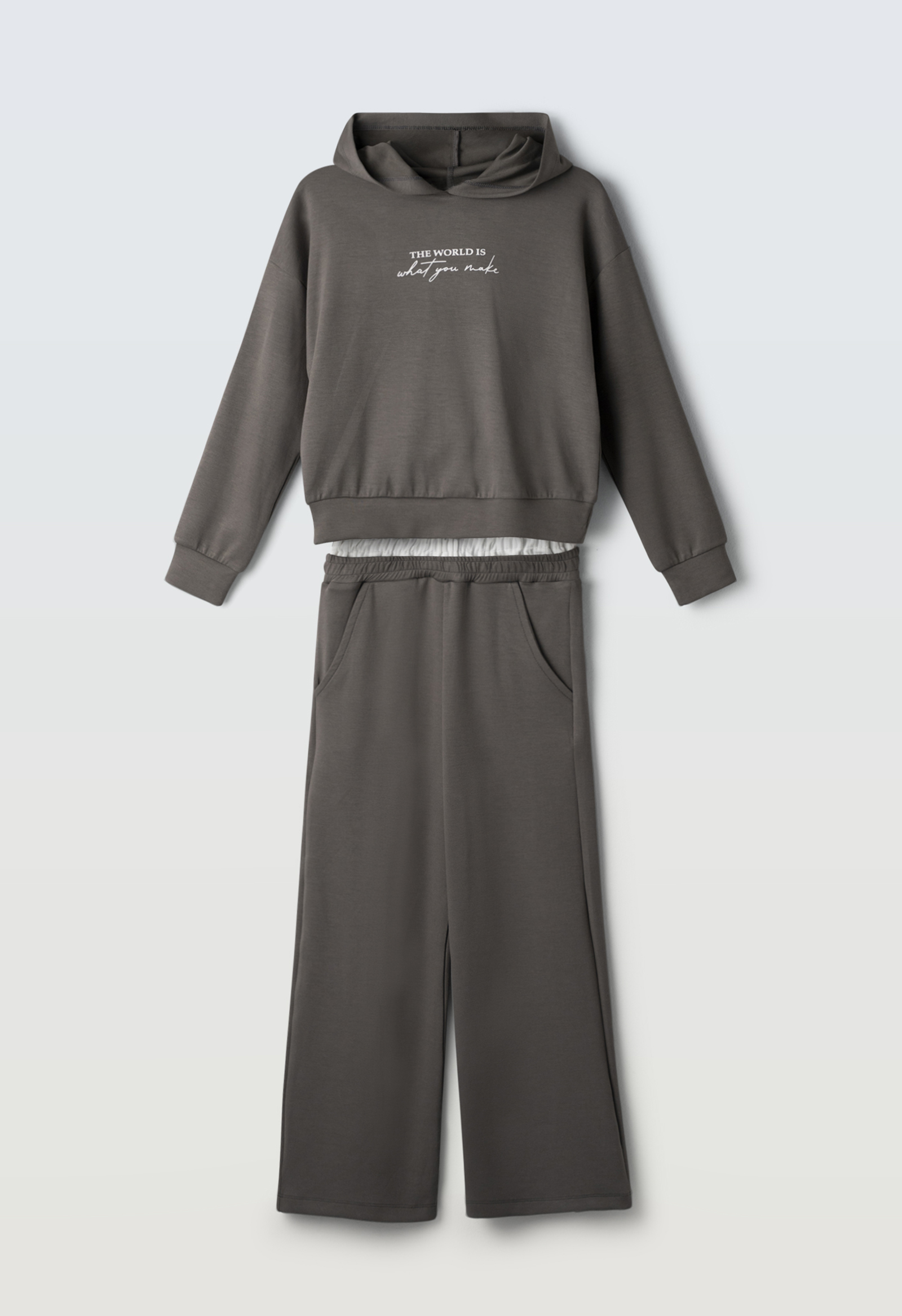 Φόρμα, μπλούζα λαδί κουκούλα με άσπρα γράμματα, παντελόνι λαδί σετ 2τμχ 47% Πλ 48% Τ