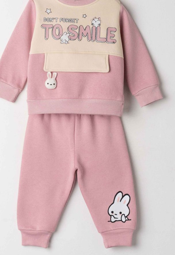 Φόρμα, μπλούζα μπεζ λαγουδάκι, παντελόνι ροζ 80% Β 20% Π